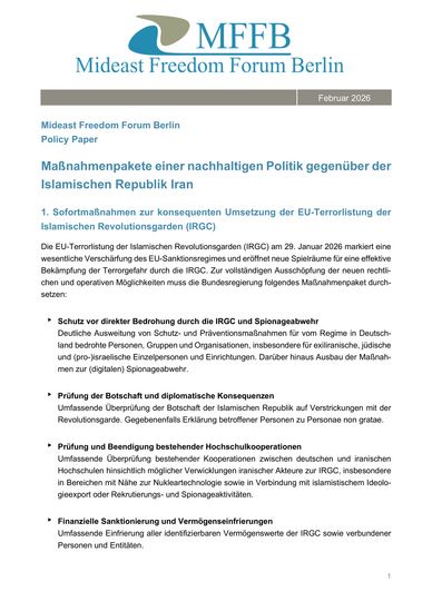 Das Mideast Freedom Forum Berlin (MFFB) veröffentlicht heute zum Start der Münchener Sicherheitskonferenz das neue Policy Paper „Maßnahmenpakete einer nachhaltigen Politik gegenüber der Islamischen Republik Iran“. Die Sicherheitskonferenz steht in diesem Jahr besonders unter dem Eindruck der beispiellosen Repressionen durch das Regime in Teheran. In seinem Policy Paper legt das MFFB ein Konzept vor, das konkrete Sofortmaßnahmen nach der EU-Terrorlistung der Islamischen Revolutionsgarden (IRGC) sowie weitergehende außen-, sicherheits- und menschenrechtspolitische Schritte fordert.
